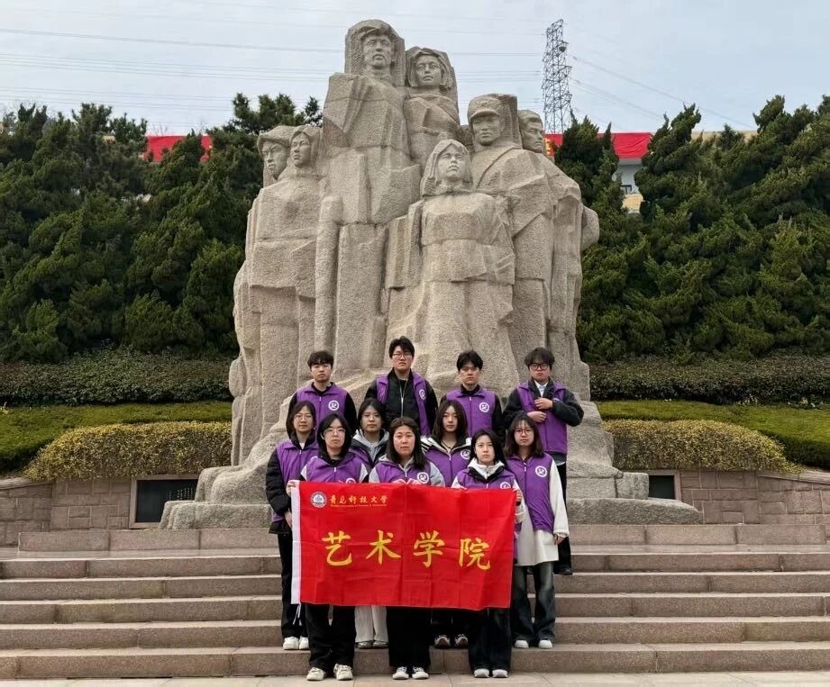 “艺术姐姐”志愿服务队走进青岛市革命纪念馆研学。在讲解员带领下,同学们参观山河魂群雕、军魂馆等展区,通过历史照片、文物与详实讲解,回顾革命先辈抗战历程,接受深刻的红色历史教育。