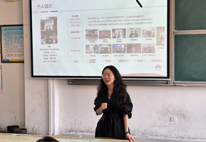 山东终端青岛区域零售经理高雅轩结合青岛市场实际,针对体验店FM、零售代表、KA代表、服务技术顾问等岗位,从市场洞察、消费者服务、人员管理等维度拆解岗位职责,梳理岗位发展路径与人才流动机制,强调华为作为多元大平台的广阔成长空间,呼应“大梦想 正当时”主题,鼓励同学们积极投递简历。