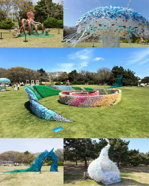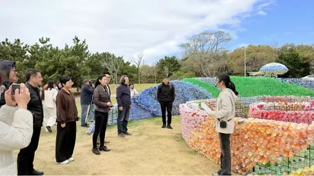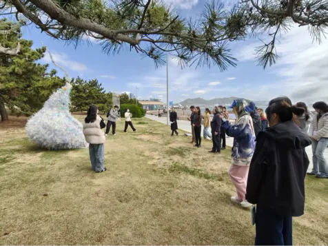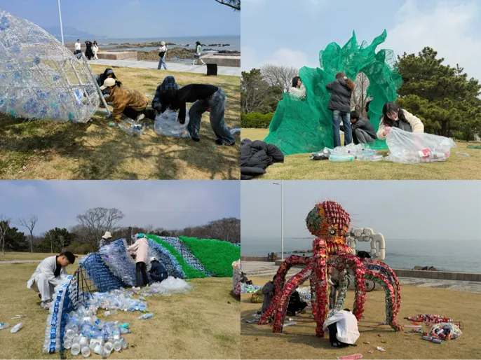 公共艺术系231班21名同学,在系主任董亮老师和青岛市公共空间艺术促进中心丁文慧老师的指导下,经历场地考察与测量、思路汇报、方案修改、确定方向、小稿制作、比列计算、工艺实验等一系列创作环节,以生活废弃物为创作媒介,紧扣海洋环保、生物多样性保护等议题,融合课堂教学与现场制作,用艺术传递资源循环、低碳理念。